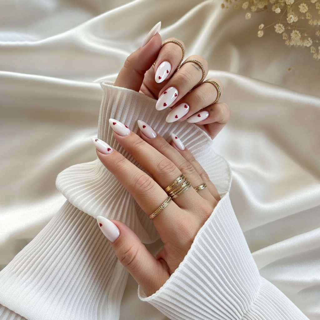 Design: Clean milky white base with precise, charming tiny red heart details.